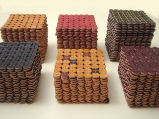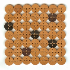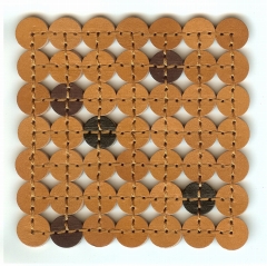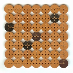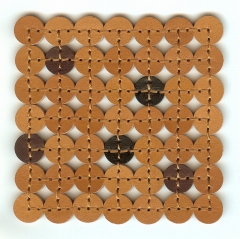 革を2枚貼り合わせ、丸くくり抜いてから1つずつ縫い繋げたコースターです。円の接点のみの接合ですので、コースター自身が動きを吸収し、変形や反りなどの防止に役立ってくれます。長く使用していても、コースターの形が崩れにくいという利点がコンセプト。