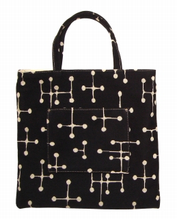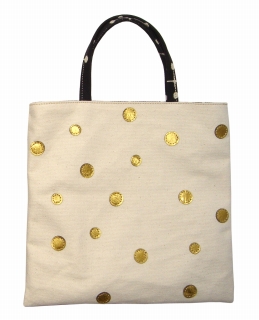 生成の帆布に金色の革を丸く縫い付けて、水玉模様にしています。そして裏地にはイームズ・テキスタイルのスモール・ドット006を使っています。尚、このバッグはリバーシブルとしてお使いいただけます。