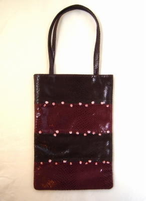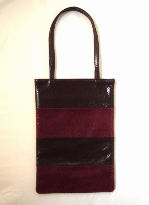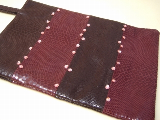 ヘビの型押しがされた光沢のあるブタ革で、こげ茶とエンジをボーダー状に縫い合わせてあります。