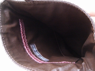 裏地はこげ茶で、内側には13cm×13cmのパッチポケットを1つ備え付けてあります。