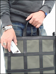 尚、黒のバッグのみ口元ファスナー仕様ではありません。口元ベロ留めです。さらにすべてのバッグに共通して外側の一部分には、名刺ケースや携帯電話が収納可能な便利ポケットが1つ付いています。