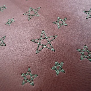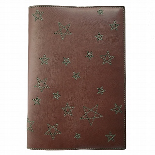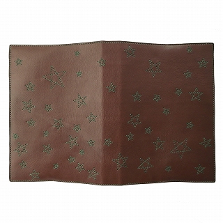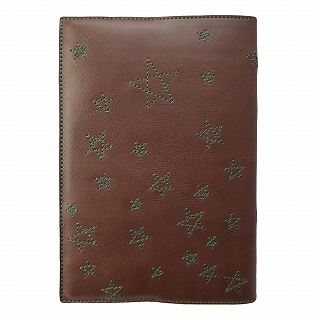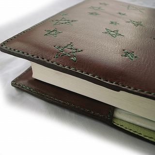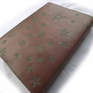 星型ステッチの刺繍をランダム配置した単行本サイズの革製ブックカバーです。単行本サイズのブックカバーは私自身なかなか出会ったことがありません。なのでつくりました。