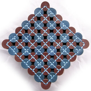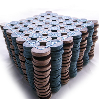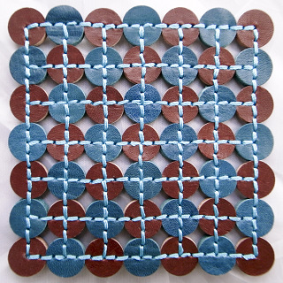 革を2枚貼り合わせ、丸くくり抜いてから1つずつ縫い繋げたコースターです。