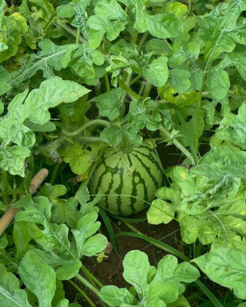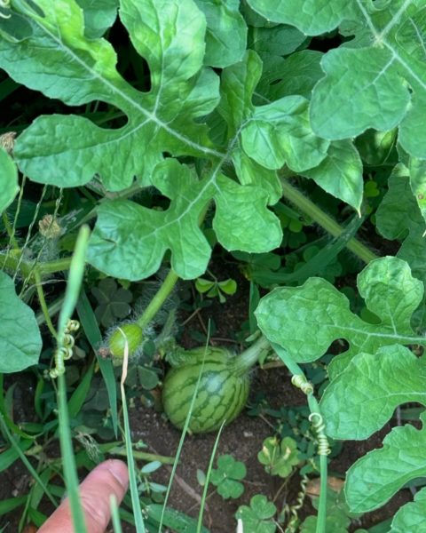 スイカ先輩 @teruko.yamamoto.7374 んちの畑のスイカに触発され、速攻うちの庭にも苗を2本植えた。もう時期が遅いかなと思いつつ、見守ってきた。