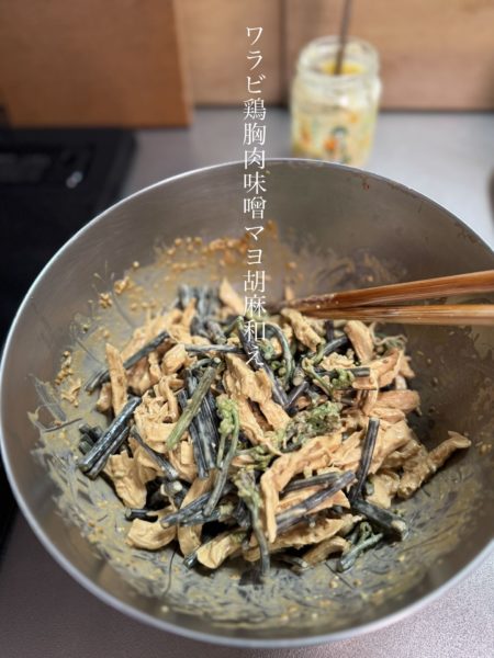 #ワラビ鶏胸肉味噌マヨ胡麻和え