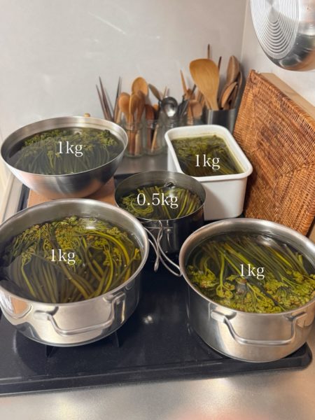 仲間夫婦はなんと7キロ!単位がおかしい。あく抜きして、またもやご近所さん2軒に1キロずつ、パン屋さんに1キロ、残りはうちで食べ続けてる。癖もないから飽きないし、栄養価も高く低カロリーなのである。